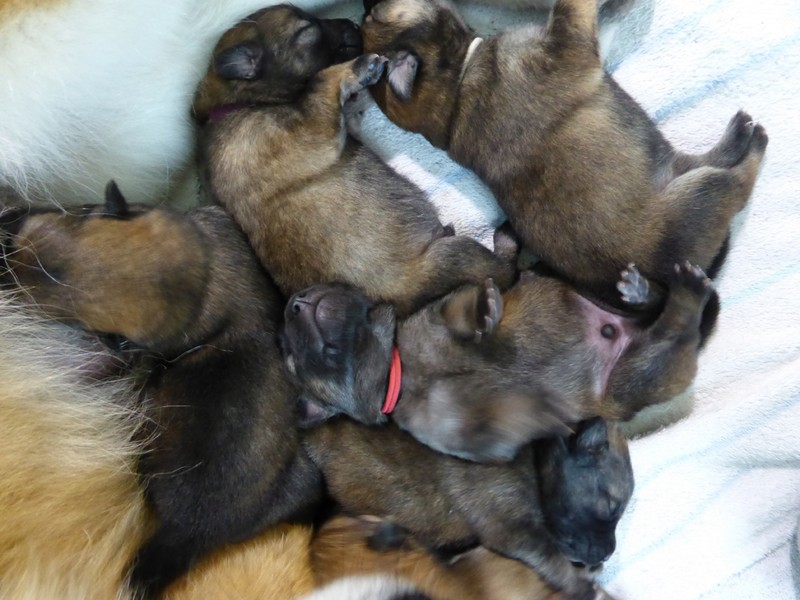 Alle Welpen laufen auf allen Vieren und alle haben die Augen mehr oder weniger offen! Natürlich können sie noch nicht richtig sehen, aber sobald Ansi an die Wurfkiste tritt, rennen alle sofort los und warten darauf, dass sie sich niederlegt. Und dann geht das Gebalge um die Zitzen los! Obwohl wir ganz am Anfang etwas unsicher waren, ob Ansi ihre Aufgabe als Hundemutter auch wichtig nimmt, macht sie es jetzt ganz toll. Alle zwei Stunden geht sie von allein in die Kiste, ihre Jungen zu säugen, zu putzen - schlafen allerdings will sie im Garten oder im Schlafzimmer. Wenn allerdings ein Alarmschrei erklingt, ist sie sofort da und schaut nach.
