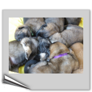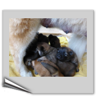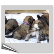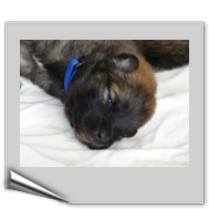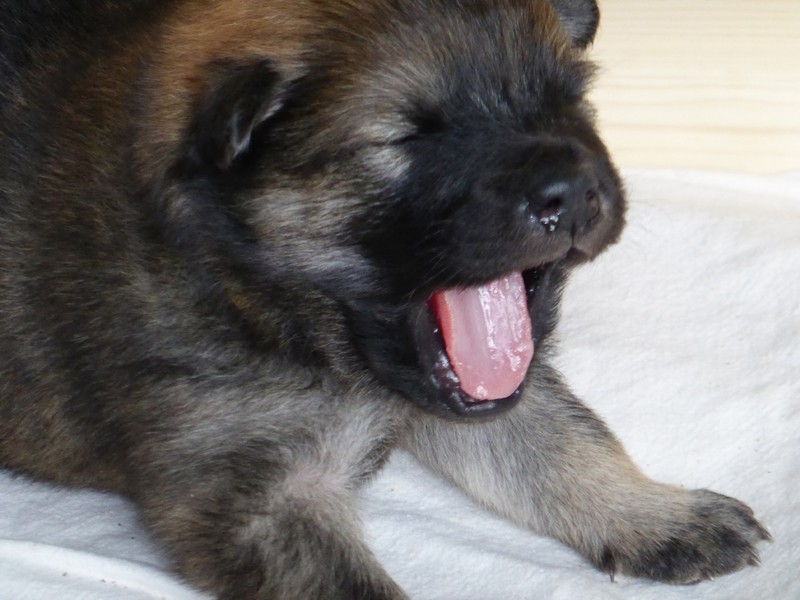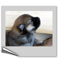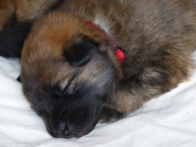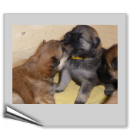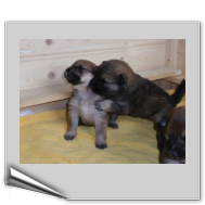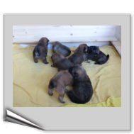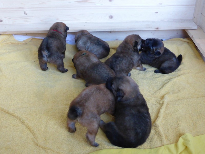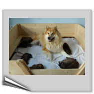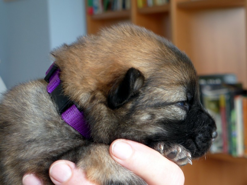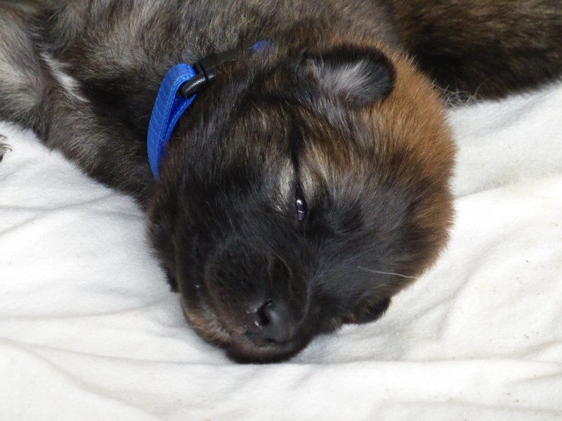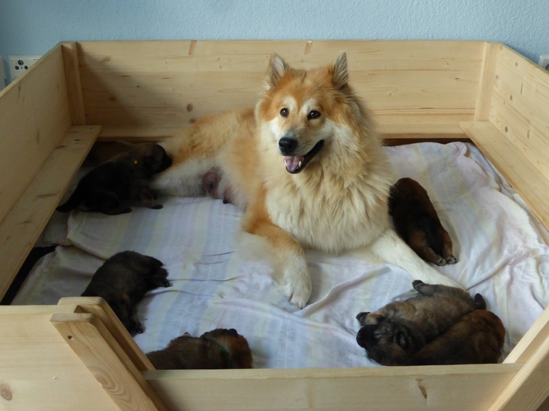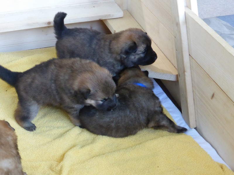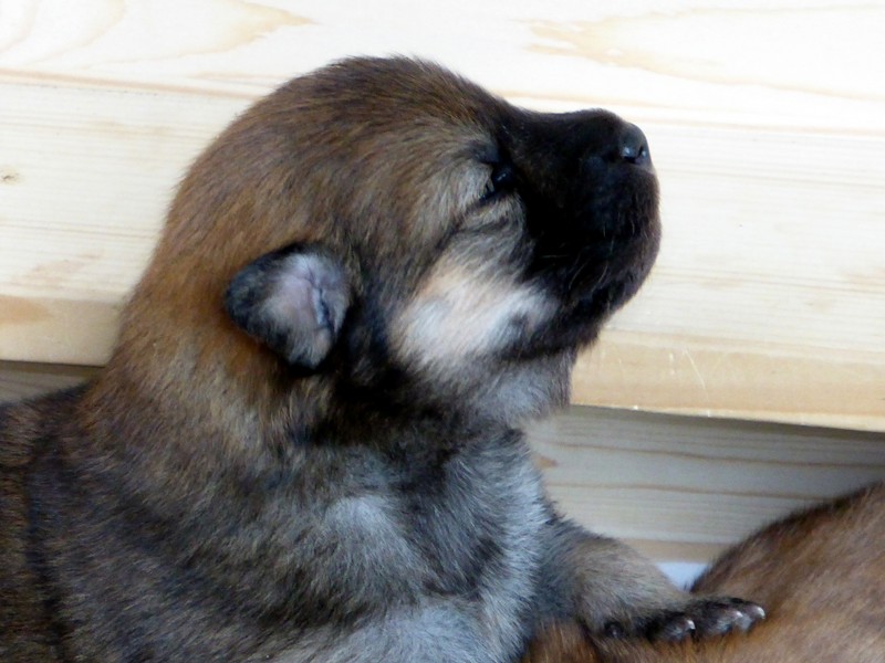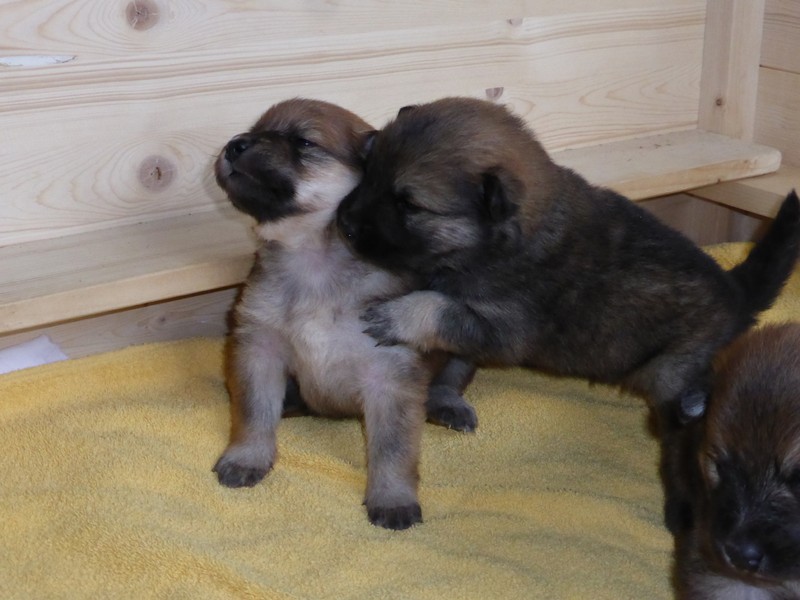 Wir haben uns lange überlegt, ob wir Namen vergeben sollen oder die Welpenkäufer "ihre" Namen vergeben. Da wir das Letztere wollten, haben nur Aika und Anikki, die beiden Mädchen, die ihre Besitzer schon haben, einen Namen. Die anderen Welpen werden noch nach ihrer Halsbandfarbe bezeichnet.