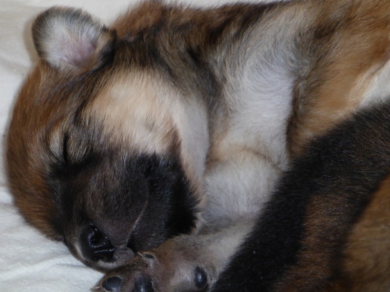 Nun sind die Zwerge schon 14 Tage alt und wiegen - bis auf Pink und Blau - schon fast 1000 g. Nun kann man auch beobachten, dass sie zueinander gezielt Kontakt aufnehmen: der Rote hat Aika die Nase abgeleckt und der Gelbe hat den kleinen Fuchs "angefressen". Bisher war es immer nur ein Zusammenschmiegen, nun ist es schon Aufeinanderzugehen.
