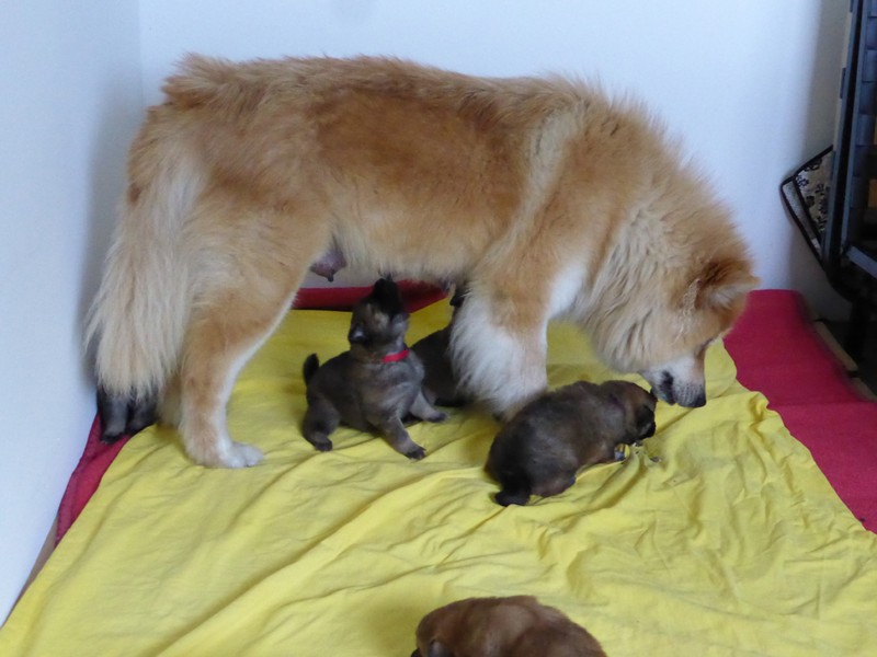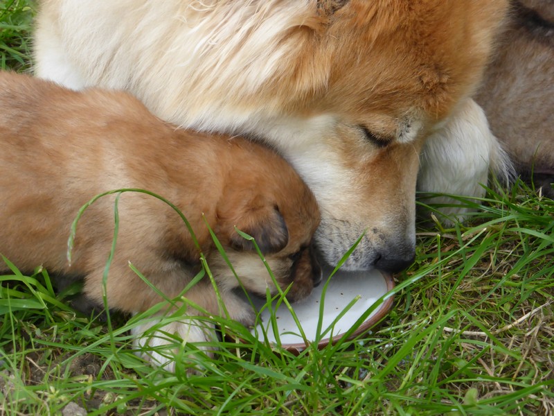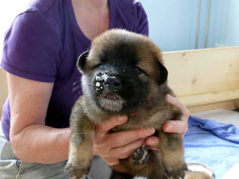 Nachdem ich am Samstag nur am Vormittag und gestern erst abends wieder da war, erschienen mir die Kleinen richtig "groß". Sie sind jetzt richtige kleine Hunde, die neugierig aus ihrer Wurfbox hinausschauen. Gestern hat Lisa schon mit Welpenmilch zugefüttert, weil uns am Samstagabend aufgefallen war, dass die Welpen nicht so zugenommen hatten, wie wir gewohnt waren. Wahrscheinlich geht langsam Ansis Milchproduktion zurück. Nach einigen Fehlversuchen konnten heute aber alle Welpen gut die gereichte Welpenmilch auslecken - und sie waren gierig danach! Und siehe da - heute Abend waren die Gewichte wieder im gewohnten Rahmen.