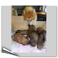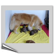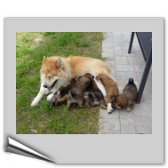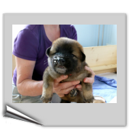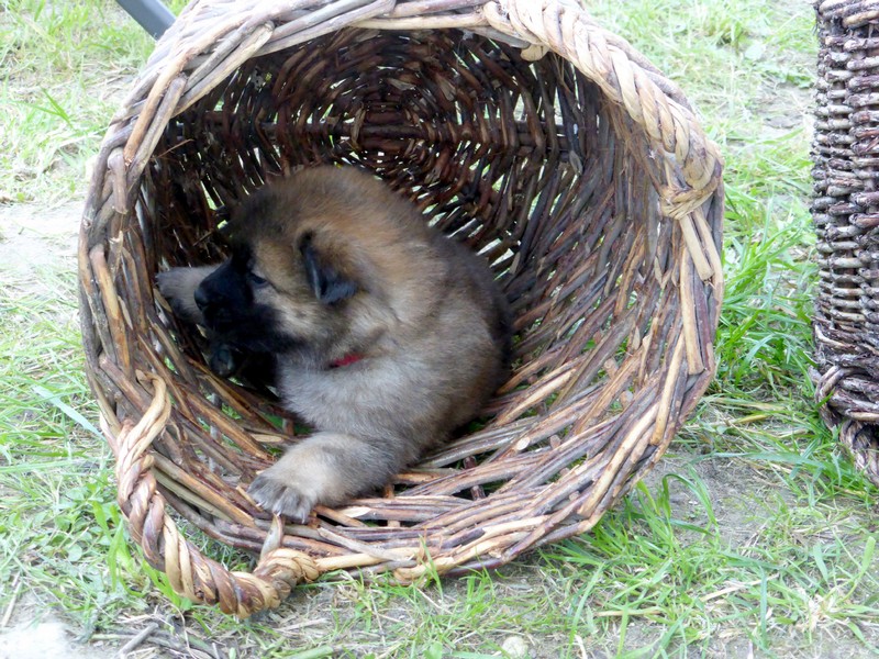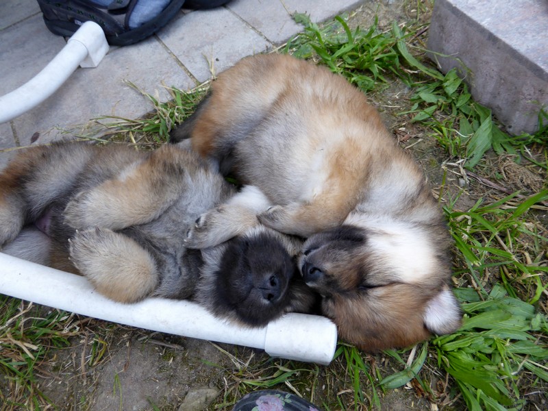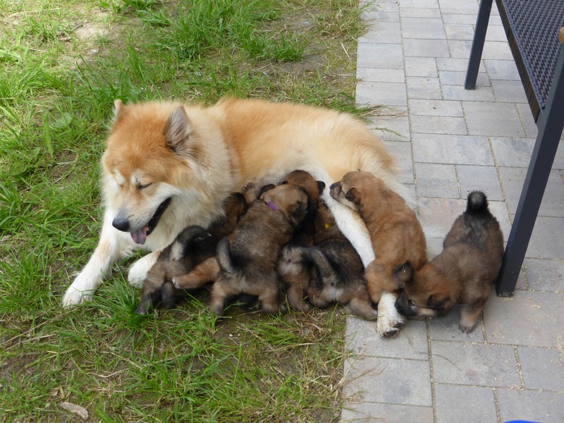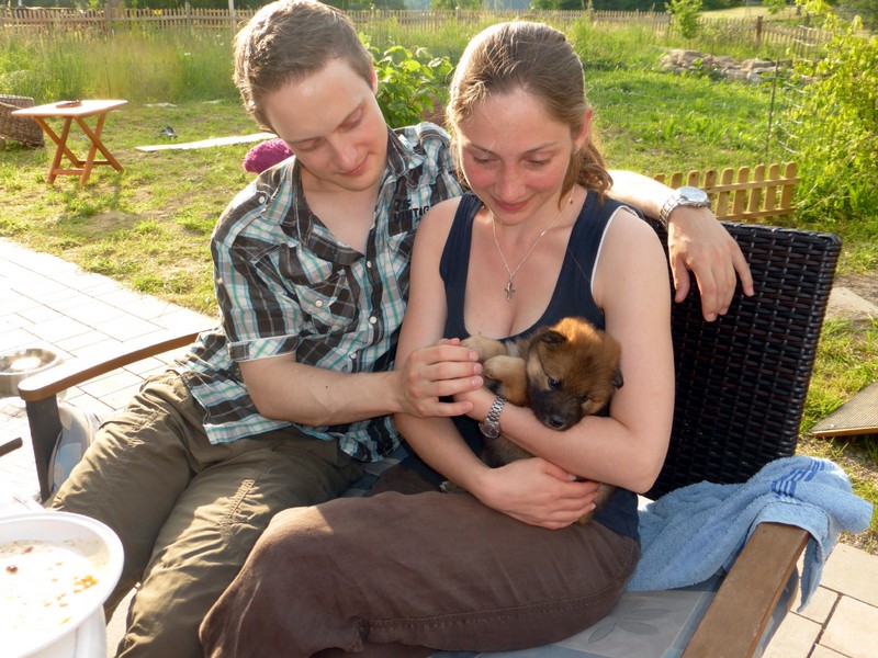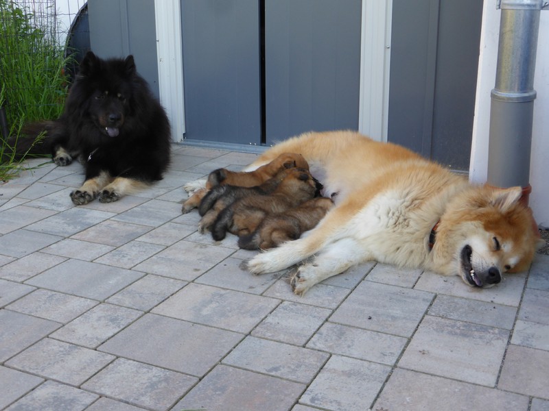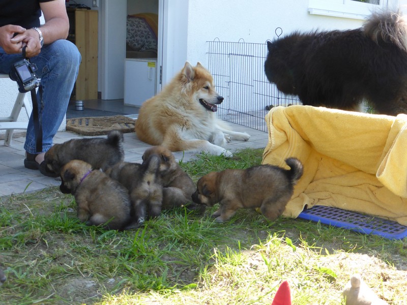 Gestern an Fronleichnam kam der Deckrüde Balu von der schönen Teck mit seinen Menschen zu Besuch, um sich seinen Sohn auszusuchen. Da der Deckrüde(nbesitzer) das "Vorkaufsrecht" hatte, konnte er entscheiden, welchen Welpen er haben wollte. Nach Aussagen von Arthur Gischel "war das sauschwer, am liebsten alle". Am Ende haben sich seine Frau und er für den kleinen "Grauen" mit dem roten Halsband entschieden. Wir sind auch der Meinung, dass der Rote gut zu Balu passt, weil er ein kleiner selbstbewusster Welpe ist, der sich aber durch fast nichts aus der Ruhe bringen lässt.
