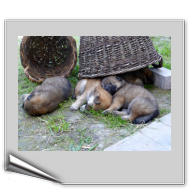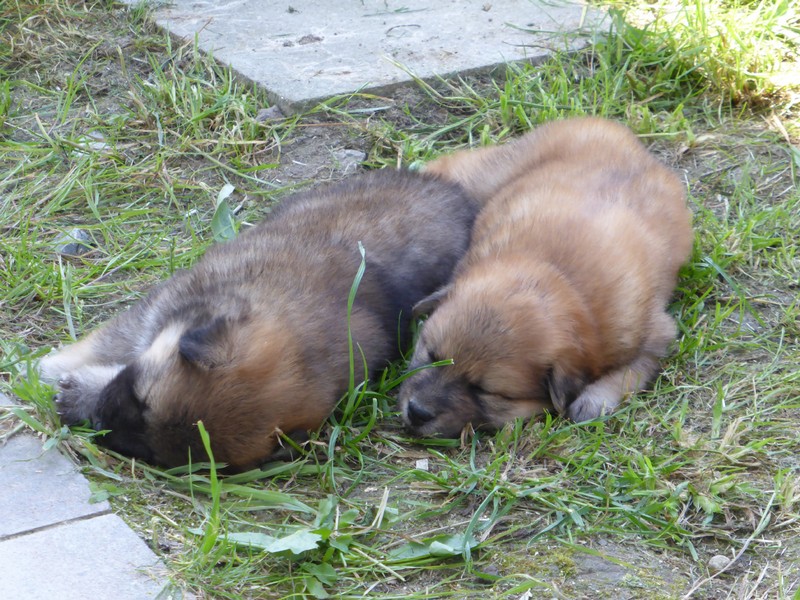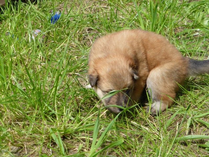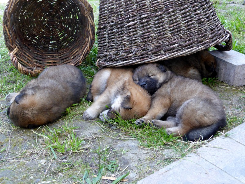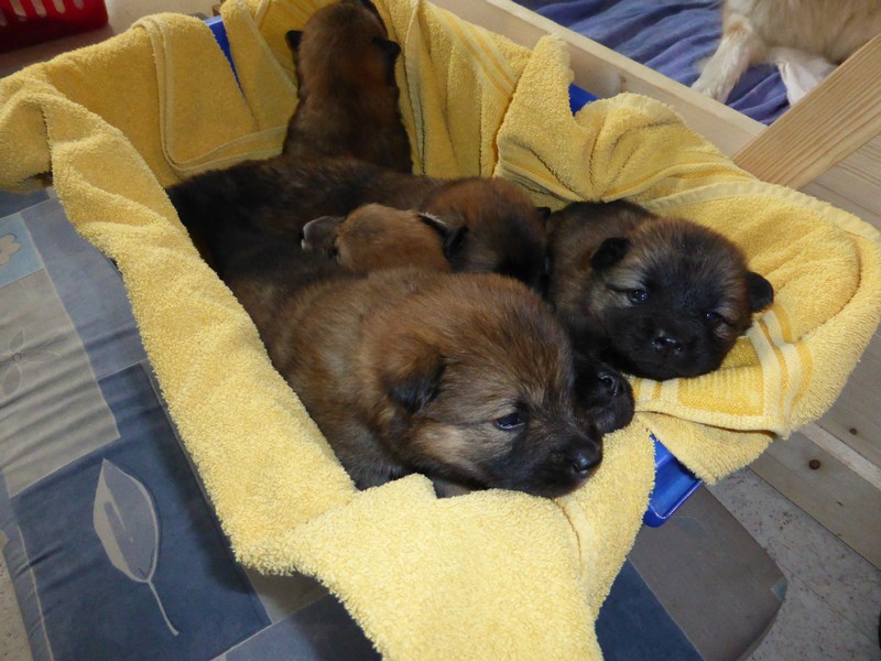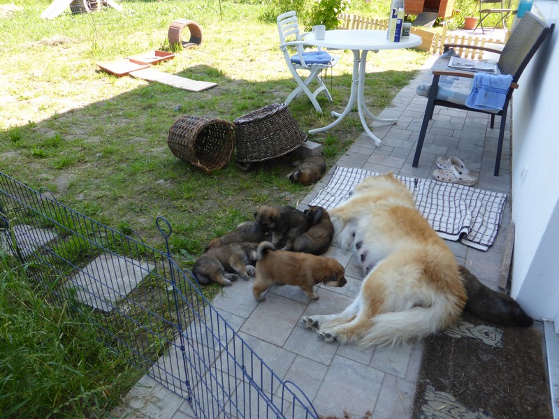 Nachdem gestern Nacht zweimal ein kleiner Hund aus der Wurfkiste geklettert war und nicht mehr zurück konnte (und deshalb ausdauernd und durchdringend quietschte), zogen wir mit der Wurfkiste wieder ins Welpenspielzimmer hinunter. Ansi ist inzwischen so selbständig, dass sie selbst entscheidet, wo sie schläft; meist schlafen die Kleinen allein und Ansi im Garten oder bei uns im Schlafzimmer.