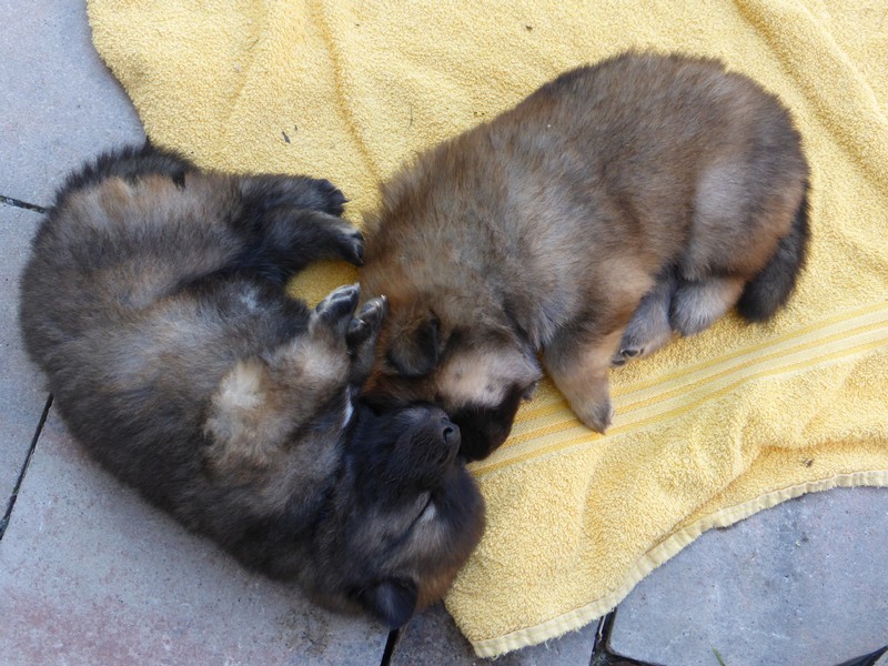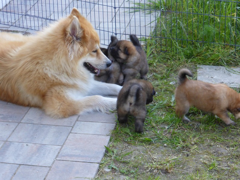 Heute Nachmittag besuchten die Kleinen zum ersten Mal ihr "Spielzimmer" im Untergeschoss. Von da aus geht dann der direkte Weg in den Garten. Sie waren zum Teil etwas ängstlich, zum Teil sehr neugierig. Aber doch waren alle auch froh, nach einer Stunde wieder in ihrer bekannten Wurfbox zu sein, mit den bekannten Gerüchen, der Begrenzung außen herum und dem gewohnten Boden. Trotzdem beginnt nun die Zeit, wo die Kleinen immer mehr Neues erfahren und erkunden sollen.