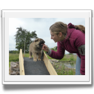 Heute kam noch einmal Angelika zum "Welpenschauen" und mit den Welpen spielen. Als gelernte Erzieherin hatte sie keine Mühe, auch ihrer Aika den Weg über den großen Baumstamm zu zeigen.