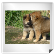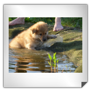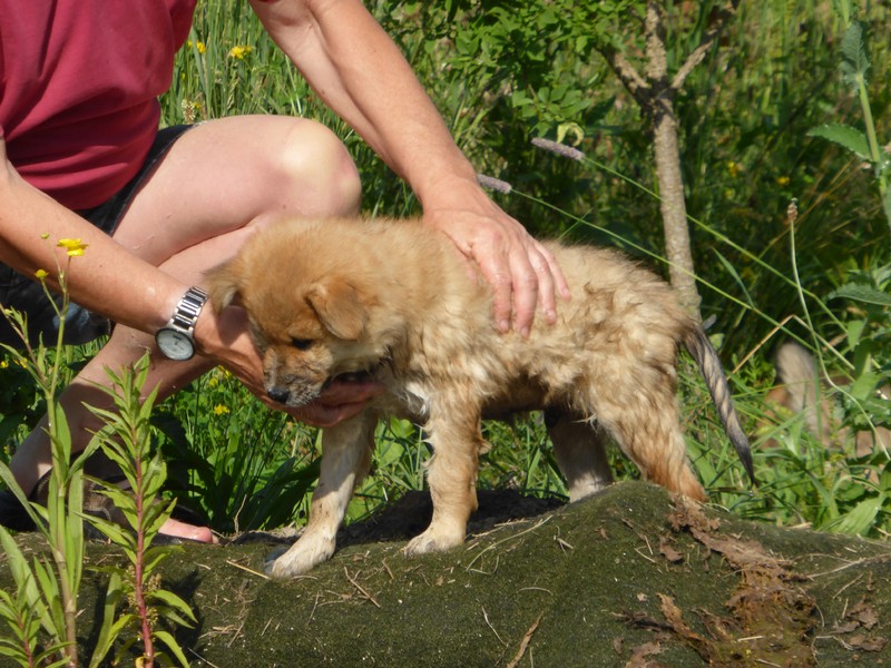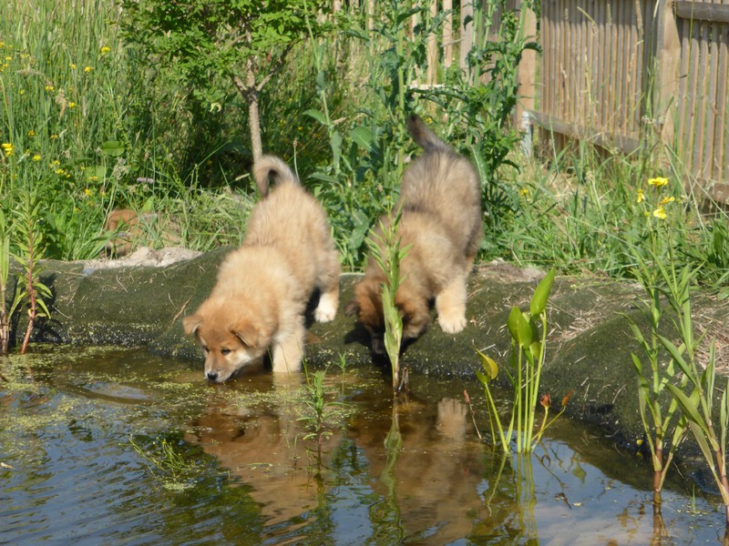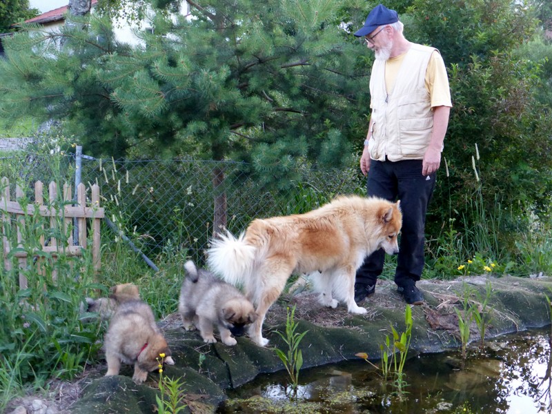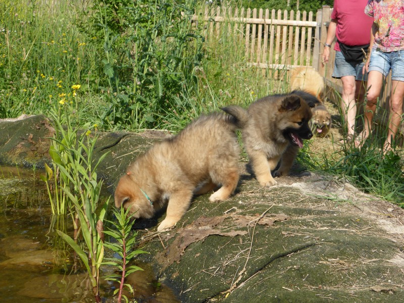 Auch heute machten wir frühmorgens wieder einen Spaziergang im "äußeren" Areal: alle Welpen kämpften sich tapfer durch das hohe Gras bis zum Teich. Einige tranken aus dem Teich und Ariko, der ja fast überall der erste ist, musste unbedingt bei den Steinen testen, wie hoch das Wasser ist. Plumps, da hatten wir sofort einen nassen kleinen Hund. Aber er kam sofort wieder heraus und schüttelte sich und lief dann weiter am Rand entlang. Demnach hat er keinen bleibenden "Wasserschaden" erlitten.