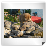Da man den Kleinen jeden Tag etwas Neues bieten soll, haben wir heute zum ersten Mal den "inneren" Garten - also das Welpenareal - verlassen und haben einige Meter im "äußeren" Garten erkundet. Als ich das Tor zum Gelände vor dem Garten aufmachte und Ansi hinauslockte, kamen gleich fünf der Zwerge mit: die beiden Mädchen waren misstrauisch und kehrten vor dem Gartentor wieder um und liefen in ihr inneres, ihnen bekanntes Areal zurück!
