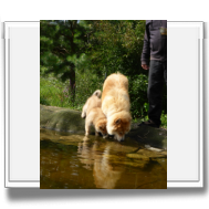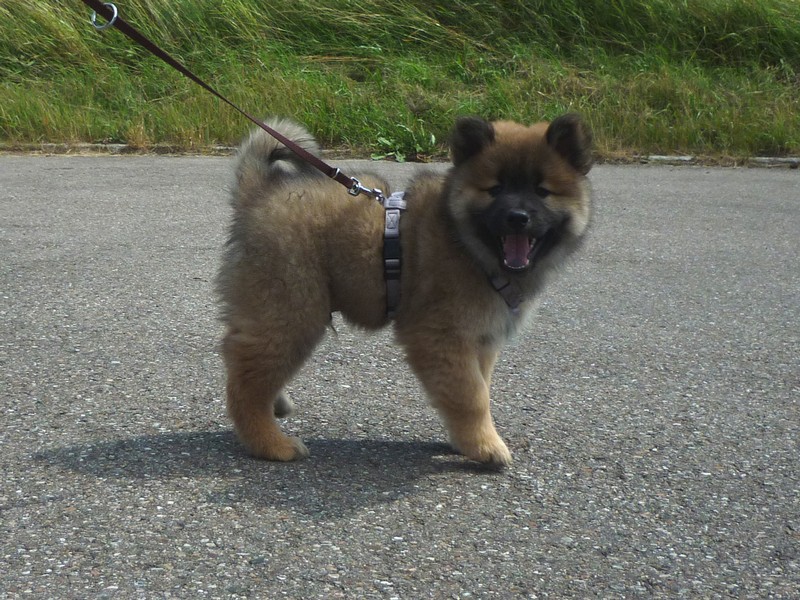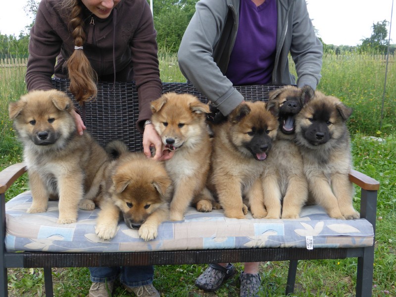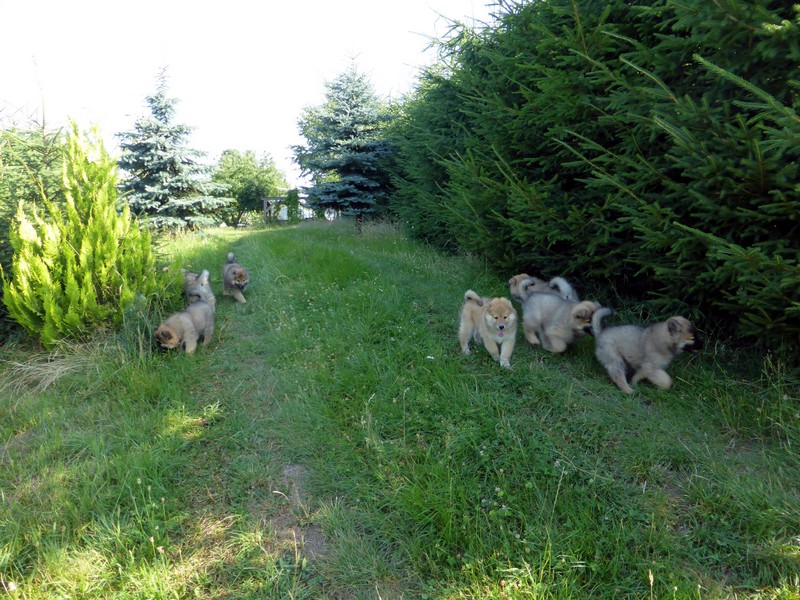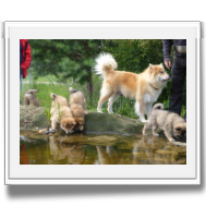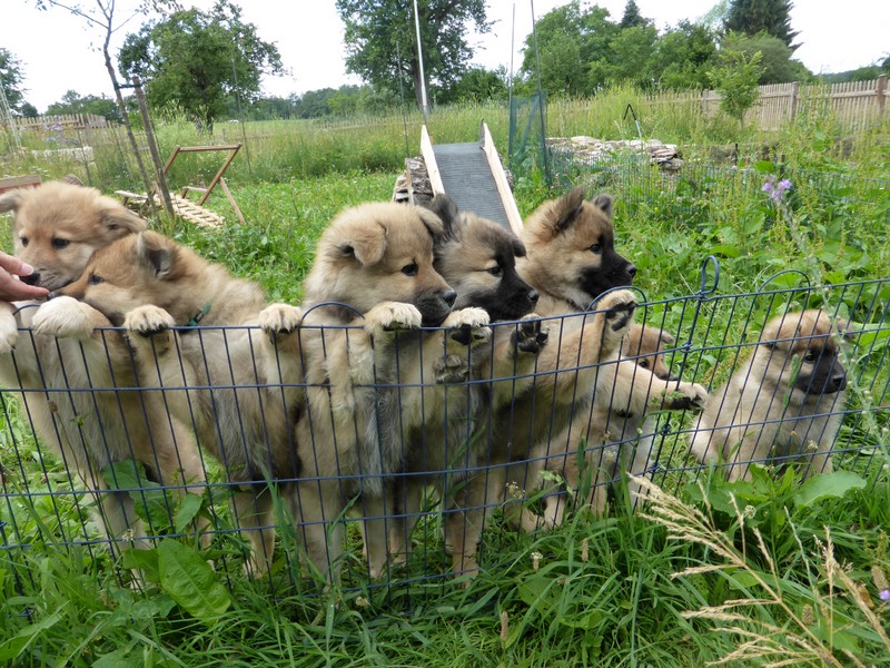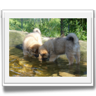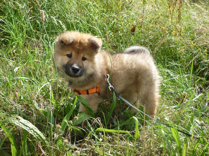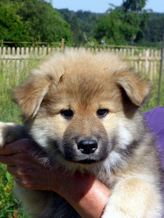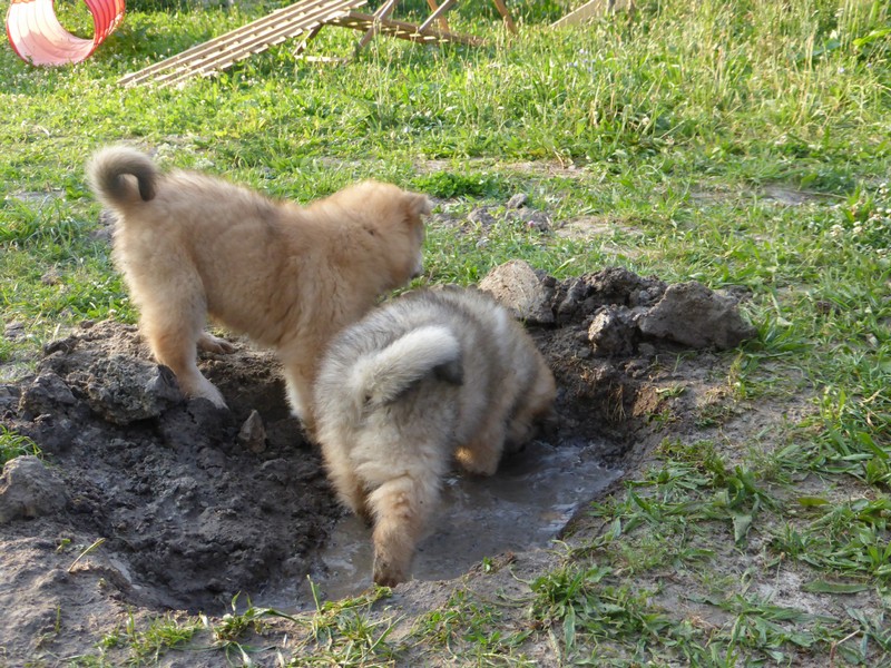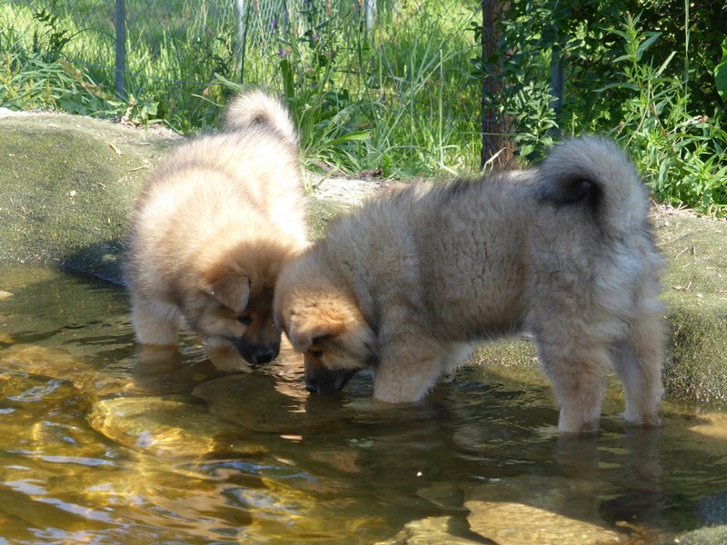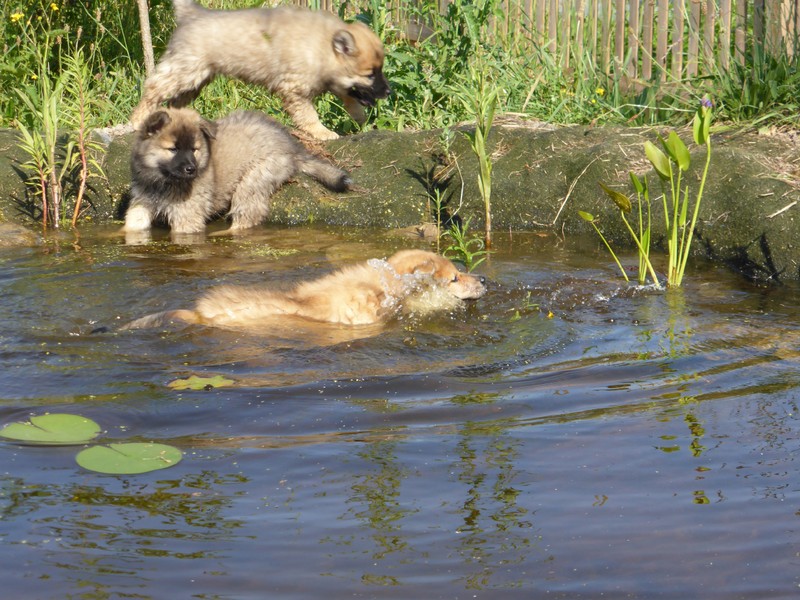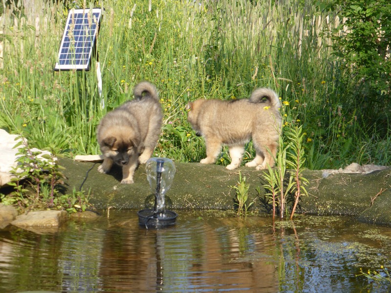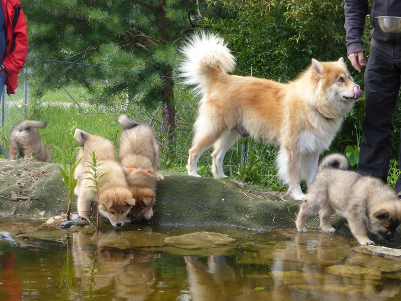 Die 9. Woche fängt an, in diesem Alter haben wir 2011 unsere Ansi in Birenbach abgeholt! Und die Zwerge sind bis zum Ende der Woche noch bei uns, am Freitag ist Abgabetag! Aber heute ist wieder Ausflugtag. Nachdem gestern wieder Wassertag war und am Nachmittag auch wieder Auto-Übungsfahrt, ist auch heute wieder die große Gartenrunde mit Teichbesuch angesagt. Da die Aika-Besitzerin Angelika wieder zu Besuch ist, können wir die Kleinen recht zwanglos laufen lassen, es ist ja immer wieder jemand in der Nähe. Auch heute zeigten Asco und Alfie wieder ihre Schwimmübungen. Nur die beiden Mädchen - besonders Anikki - sind vom Wasser nicht sehr begeistert. Darin ist Anikki ihrer Mutter sehr ähnlich.