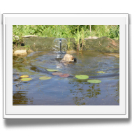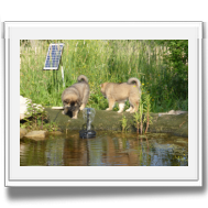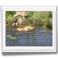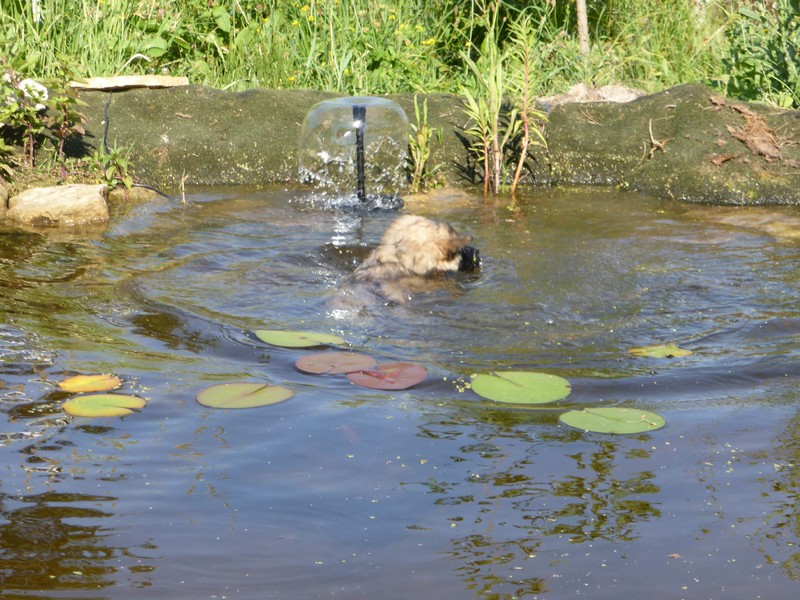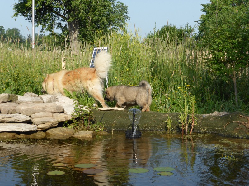 Und heute war es gleich doppelt aufregend: Am Morgen machte die Zwergenschar mit uns den ersten größeren Ausflug weg vom Garten, über die Straße in die fremde Wiese! Ich weiß nicht, wie aufregend es für die Welpen war - wir jedenfalls waren hinterher vor lauter Aufregung ganz verschwitzt. Und deshalb besuchten wir wieder unseren Teich, in dem Asco und Alfie wieder ihre Schwimmrunden drehten.