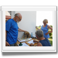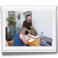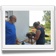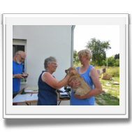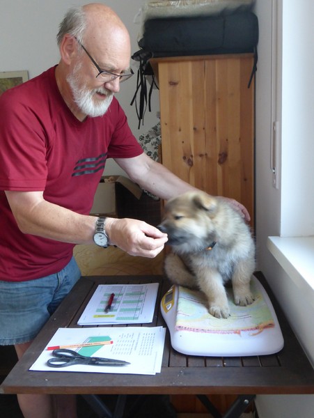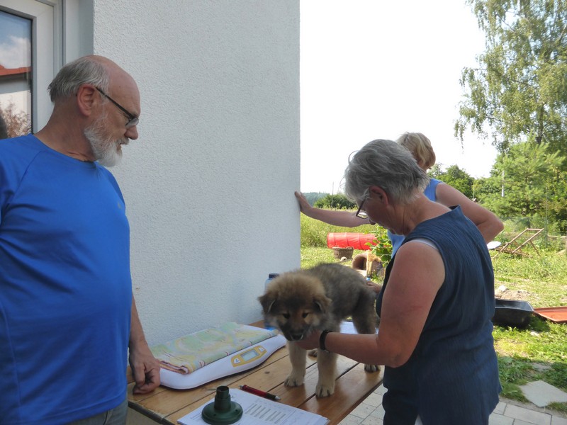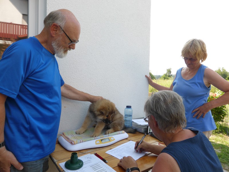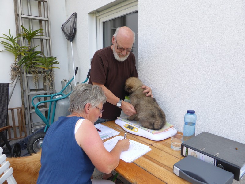 Am Nachmittag kam Ina Sievers dann zur Wurfabnahme. Alle Welpen wurden begutachtet, die Zähne wurden kontrolliert, die Zehen, sie wurden gewogen und das Fell wurde beurteilt. Auch hier fielen alle Welpen durch ihre Souveränität und Coolness auf. Die Zuchtwartin war vollauf zufrieden mit dem ganzen Wurf. Nur bei der Farbe, da tat sie sich etwas schwer. Es sind eben doch "Überraschungspakete" in punkto Farbe.