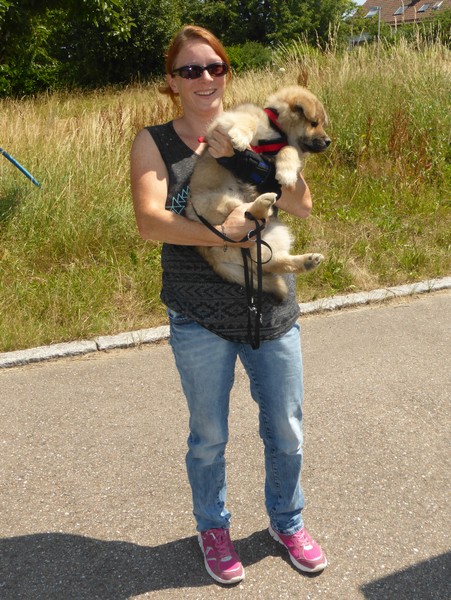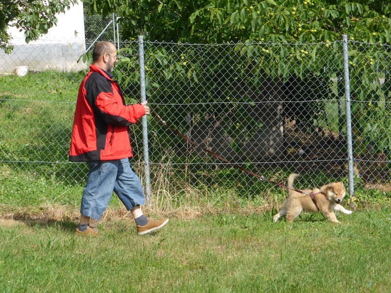 Am Vormittag wurde wieder eine Autofahr-Runde eingebaut, danach gingen wir wieder mit den Leinen los, immer zwei Welpen für sich. Zwar haben die anderen protestiert, aber das ist auch eine Übung zum zukünftigen "Fehlen" der Geschwister.
