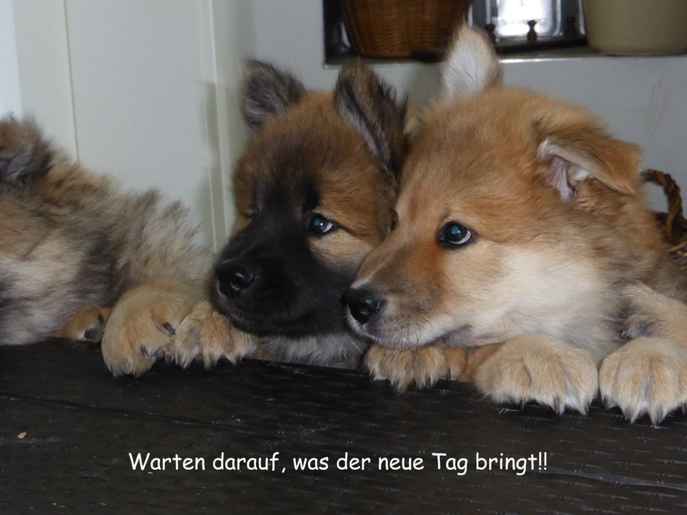 Nun ist der Tag da, an dem die Welpen in ihre neuen Familien gehen werden. Einerseits sind wir froh, dass wir eventuell wieder etwas mehr schlafen können als bisher, andererseits - es wird kein Gewusel, Gekreische, Geknurre usw. mehr sein, kurz, es wird eine Menge fehlen. Aber wir wissen, dass alle Welpen ein tolles neues Zuhause bekommen, dass sie Menschen bekommen, die sich intensiv um sie kümmern werden und deshalb ist der Abschied auch nicht ganz so traurig. Wir hatten bewusst so geplant, dass fast alle Welpen - bis auf Anton - an diesem Freitag abgeholt werden können, auch damit für Ansi "ein Schnitt" gemacht ist. Die Arme ist langsam total platt, sie meint natürlich, dass sie die ganze Zeit auf die Welpen aufpassen müsse. Und damit kommt sie kaum zu ihrem nötigen Schlaf.