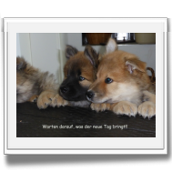 Am späten Nachmittag versuchten wir dann, auf der Bank bzw. am Zaun zu einem brauchbaren Wurfbild aller Welpen zu kommen! Hoffnungsloses Unterfangen. Entweder erblickte einer woanders etwas Interessanteres und war plötzlich weg oder Aika fühlte sich eingekeilt und wehrte sich vehement, oder Alfie wollte partout nicht diesen Nachbarn neben sich, der jetzt da war. Nach einiger Zeit haben wir den Versuch abgebrochen und hoffen auf "gelassenere" Zeiten.