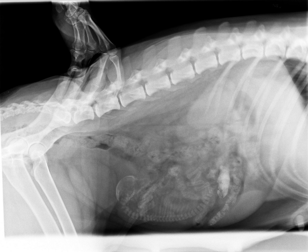 Als sich am 63. Tag immer noch nichts tat, meldeten wir uns bei der Tierärztpraxis an und machten am 64. Tag eine Röntgenaufnahme und einen Ultraschall. Im Röntgenbild zeigte sich, dass ein Welpe vorhanden war, im Ultraschall machte die Tierärztin Herztöne aus. Ansi zeigte immer noch keine Anzeichen von Wehen!