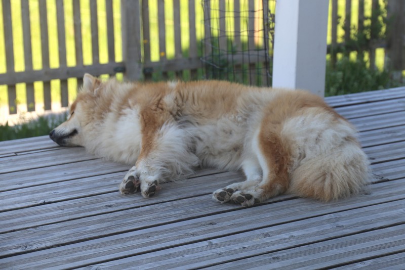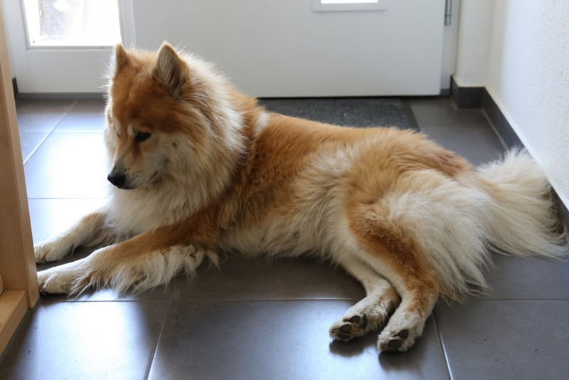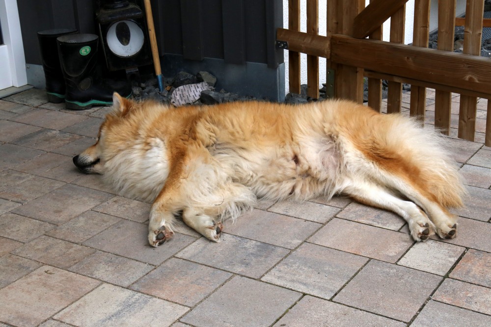 Gestern war Anikki auf der Ausstellung in Saarbrücken, sie hat dort ein "Vorzüglich" geholt und den 3. Platz gemacht. Ansi war dabei daheim geblieben, denn Aika war ja das Wochenende zu Besuch. Heute ist sie etwas geschafft und schläft. Das Bäuchlein rundet sich zusehens, sie ist heute beim 41. Tag der Trächtigkeit (vom 1. Decktermin gerechnet). Demnach hat sie zwei Drittel der Trächtigkeit hinter sich und jetzt kommen die letzten 20-22 Tage. Wir sind ungeheuer gespannt!